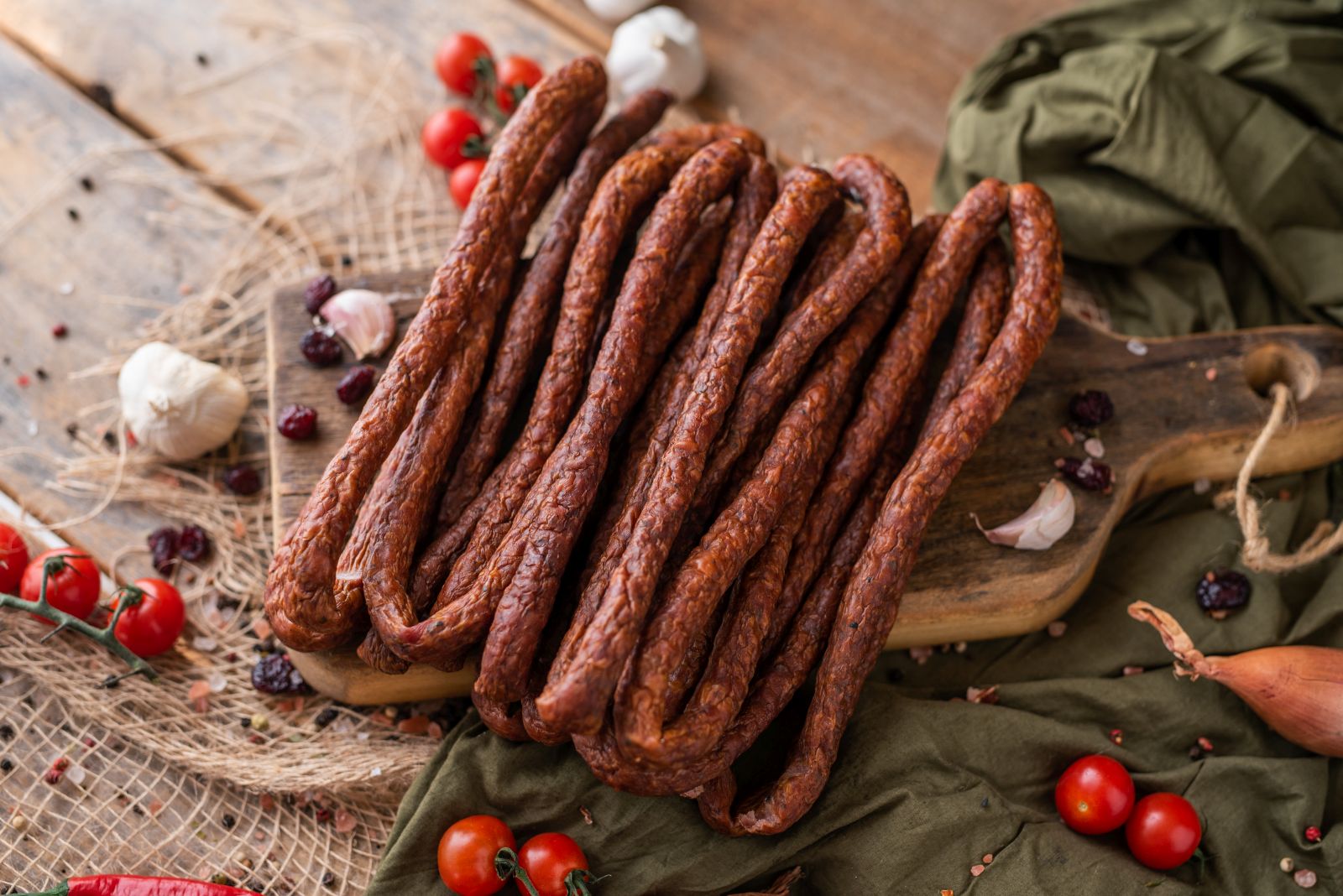 Kiełbasa wieprzowo – drobiowo – wołowa w jelicie baranim, średnio rozdrobniona, pieczona, wędzona. Do wyprodukowania 100 g kiełbasy zużyto 116 g surowca mięsnego. Produkt bezglutenowy.